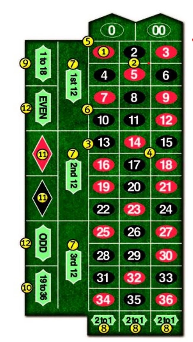 The diagram indicates the Roulette rules payout for single chip bets and the many combinations available to you. The dealer will be happy to explain any of them. The exact placement of the chips determine the bet being made. Each player is responsible for the correct positioning of their wager on the layout regardless of whether the bet is placed by the dealer.